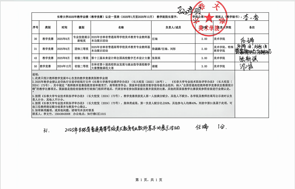 长春大学美术学院2025年教学业绩(教学竞赛)认定一览表(补充)